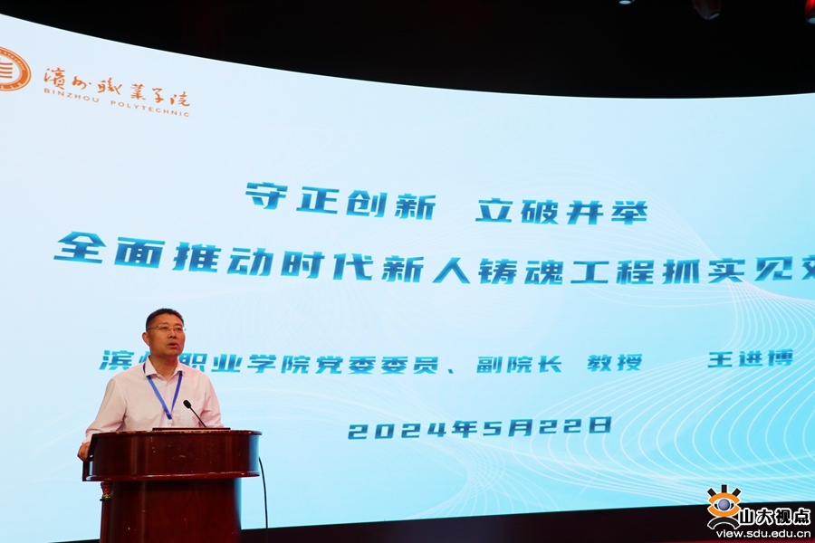 南京航空航天大学徐川教授受邀以“聚焦铸魂育人,彰显思想伟力——谈谈思政工作怎么做”为题作主旨报告。他以“川流不息思政工作体系”为例,结合自身工作实践深入分析了高校思政工作当前形势、发展方向和教学方法,为各高校进一步做好学生思政工作提供了科学有效的经验指导。中国海洋大学、山东师范大学、山东理工大学、山东交通学院、滨州职业学院等五所高校分别围绕推进“一站式”学生社区建设、心理育人工作体系建设、辅导员专业化发展精准赋能和推进时代新人铸魂工程等主题作交流发言。