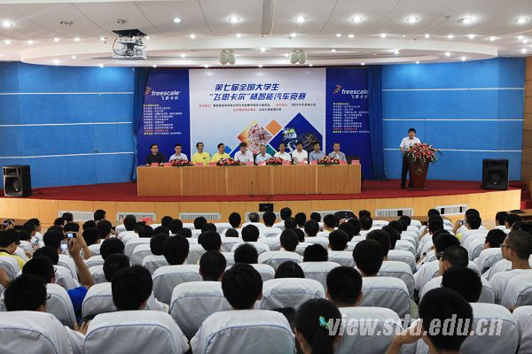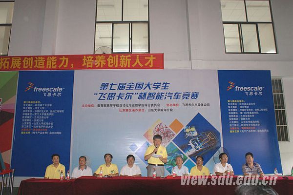 [本站讯]7月20至21日,由教育部高等学校自动化专业教学指导分委员会主办,山东大学威海校区承办的第七届全国大学生“飞思卡尔”杯智能汽车竞赛山东赛区比赛在威海校区举行。山东大学威海校区副校长陈冠军,教育部高等学校自动化专业教学指导委员会副主任、北京航空航天大学申功璋教授,全国大学生“飞思卡尔”杯智能汽车竞赛秘书处邵贝贝教授、王普教授,飞思卡尔(中国)半导体汽车电子工程经理康晓敦,山东金宇轮胎股份有限公司人力资源部经理王晓宇,山东玲珑集团党委副书记张琦,威海北洋电气集团副总经理孙忠周,山东省自动化学会秘书长王起功,威海市科协主席王麦壮,山东大学威海校区机电与信息工程学院院长蒋保臣等出席开幕式。开幕式由山东大学威海校区教务处处长刘海主持。