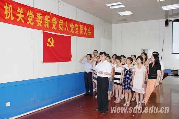[本站讯]6月21日上午,机关党委在中心校区数学楼二层研究生院会议室举行新党员入党宣誓大会,17名新党员面对鲜红的党旗庄严宣誓,以此庆祝建党91周年。机关党委书记王兰秋主持宣誓大会。