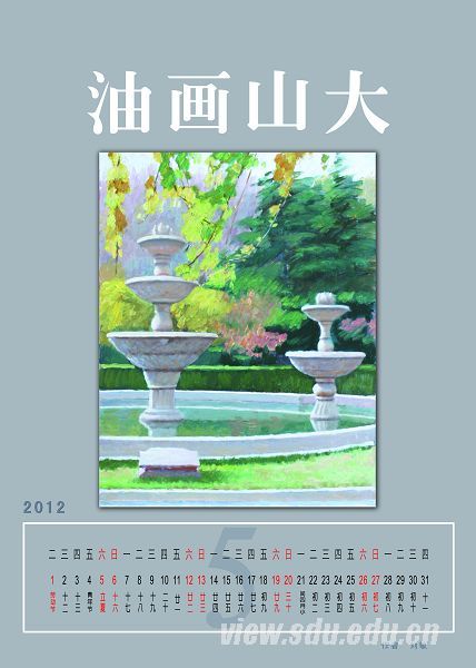 新推出的2012年《油画山大》挂历每幅画面均是学校宣传部刘敏老师的油画作品,与《山大校园风景》挂历形成校园风景系列,用油画的形式对山大的校园环境进行了生动、真实的艺术再现,体现了画家作为山大人对学校的真挚情感。《油画山大》展现了各个校区不同的风景,既有体现山大百年文化积淀的老建筑,又有山大近年来的新建筑、新景观。校庆前夕落成的大成广场、获得齐鲁文化新地标称号的知新楼、镌刻“为天下储人才,为国家图富强”办学目标的校规石等景观都通过作者的画笔在挂历上得到展现,体现了学校110周年校庆之际生机勃勃的风貌,预示着学校充满希望的未来。