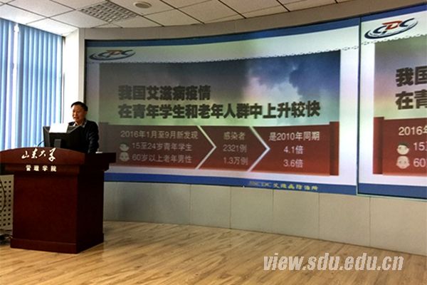 [本站讯]12月8日下午,山东大学艾滋病防控健康教育第六场专家讲座在中心校区举行。济南市疾病预防控制中心性病艾滋病防制所副所长张昌庆作了专题讲座。