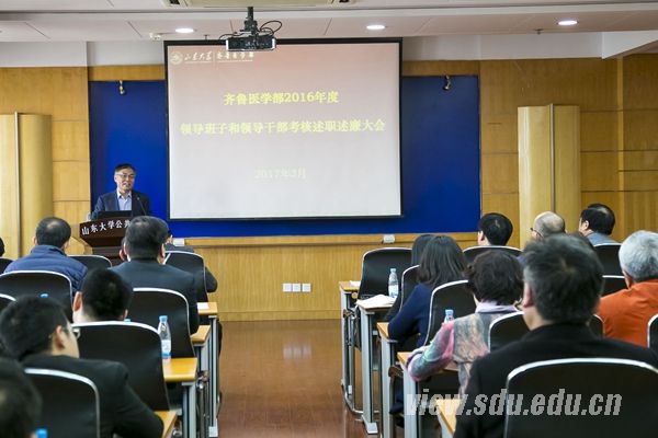 [本站讯]3月14日上午,齐鲁医学部在趵突泉校区召开2016年度领导班子和领导干部考核述职述廉大会。齐鲁医学部党工委书记侯俊平,常务副部长孔北华,副部长贾继辉、王凤山参加会议。党工委副书记陈鑫主持会议。