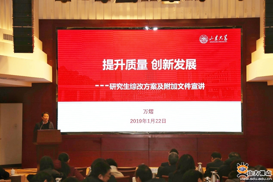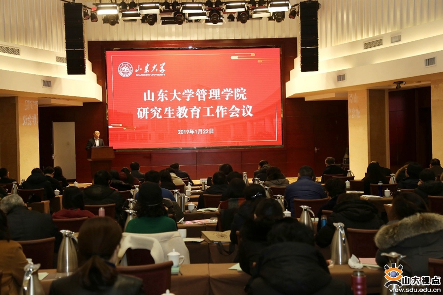 [本站讯]1月22日,管理学院在济南召开2019年研究生教育工作会议,进一步宣传落实全国教育大会精神及学校十四次党代会精神,对学院学位与研究生教育工作进行研讨并部署新时期工作。会议邀请到北京大学光华管理学院张志学教授、山东大学研究生院副院长万熠作专题报告,管理学院党委书记吉小青以及学院研究生导师等90余名教师参加会议。