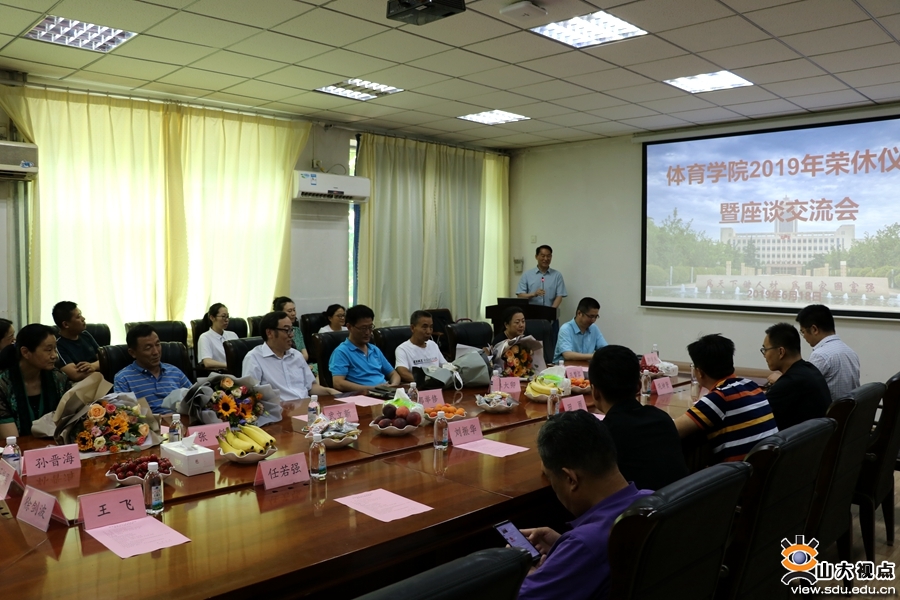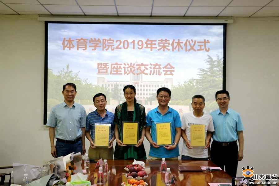 [本站讯]6月18日,体育学院在千佛山校区举行2019年度退休老师荣休仪式及座谈交流活动。校离退休工作处处长郭举修,体育学院党委书记、院长孙晋海,党委常务副书记郭学庆,正处级组织员任若强,副院长石振国、徐剑波、王飞,党委副书记周庆华,荣休老师孔繁江、单大卯、武立新、张敏参加了荣休仪式。仪式由郭学庆主持。