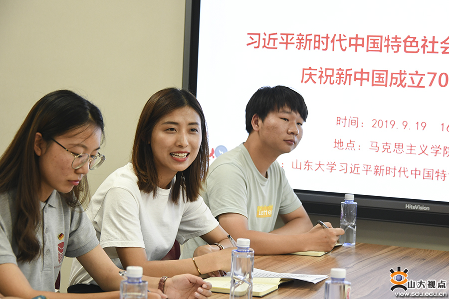活动伊始,与会成员集体观看了“庆祝新中国70周年”微视频《70年岁月如歌》。随后,六位来自不同年级、不同专业的同学围绕“结合新中国成立70周年取得的历史性成就,谈如何深化只有中国特色社会主义才能发展中国的理论认识”和“结合学习习近平新时代中国特色社会主义思想,谈如何增强做合格社会主义建设者和接班人的思想自觉和行动自觉”两个话题,分别论述了中国共产党何以带领中国走向世界舞台中央、运用融媒体促进习近平新时代中国特色社会主义思想武装当代大学生头脑的方式方法、中国特色社会主义的优势、如何立足马克思主义理论专业做合格社会主义建设者和接班人、新中国成立及改革开放带来的巨大变化、社会主义文化的优越性和走中国道路的重要意义。