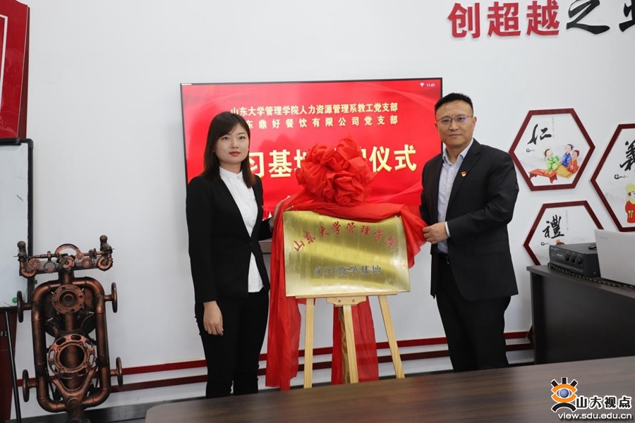 石岩与韩震为支部结对共建进行了揭牌。管理学院人力资源管理系教工党支部书记蔡地与山东鼎好餐饮有限公司人事部经理孔维秀进行了支部结对共建签约。与会人员对“‘蔡地工作室’支部共建示范点”“山东大学管理学院实习教学基地”进行了揭牌。