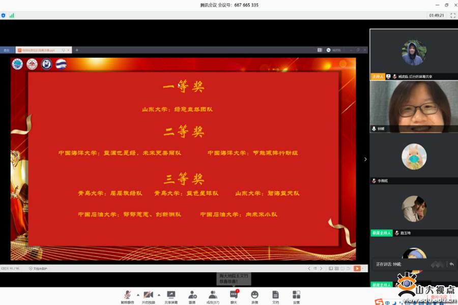 此次竞赛为线上进行,经初赛后,四所高校的八支队伍突出重围,进入决赛。中国海洋大学团委副书记钟媛、中国海洋大学海洋地球科学学院团委书记张婧、辅导员董力超,山东大学环境科学与工程学院团委书记李紫薇出席活动。主办方邀请了中国海洋大学海洋地球科学学院党委副书记张殿镇、教授毕乃双作为点评嘉宾。