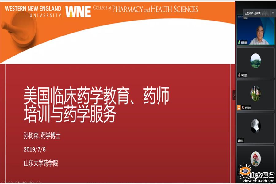 张娜教授首先向学生说明了开设《药学科学进展》暑期课程的意义,要求同学们准时参与课堂学习,积极互动。张建教授介绍了课程主讲教师、临床药学系兼职副主任、美国西新英格兰大学药学与健康科学学院孙树森副教授,并感谢孙树森副教授多年来对山东大学临床药学专业建设工作的支持。开班仪式结束后,孙树森副教授进行了第一课“美国临床药学教育、药师培训与药学服务”的讲授。