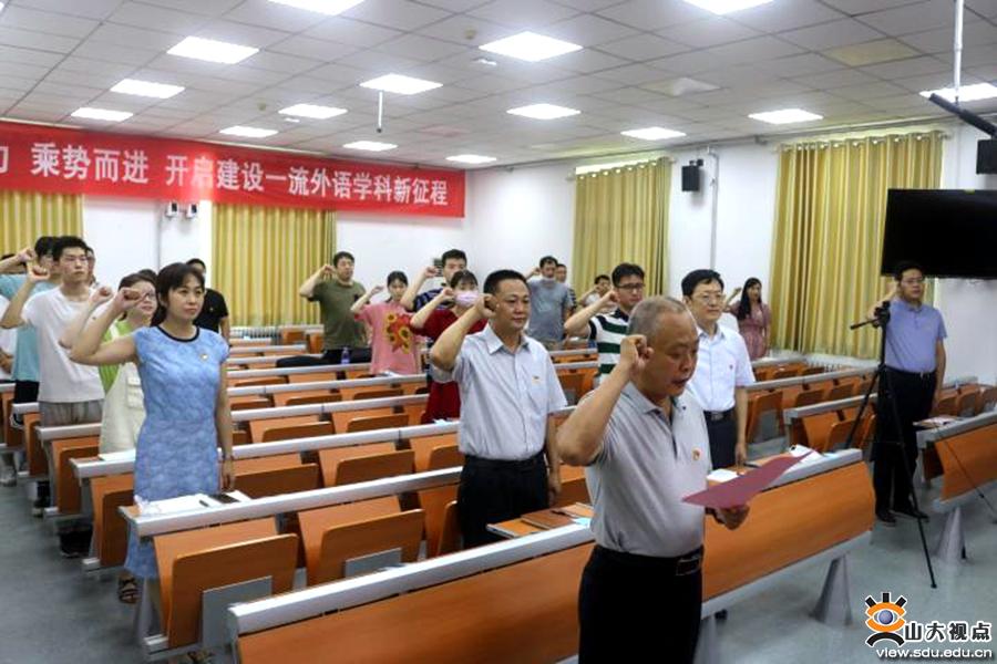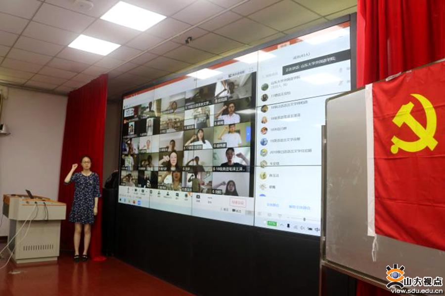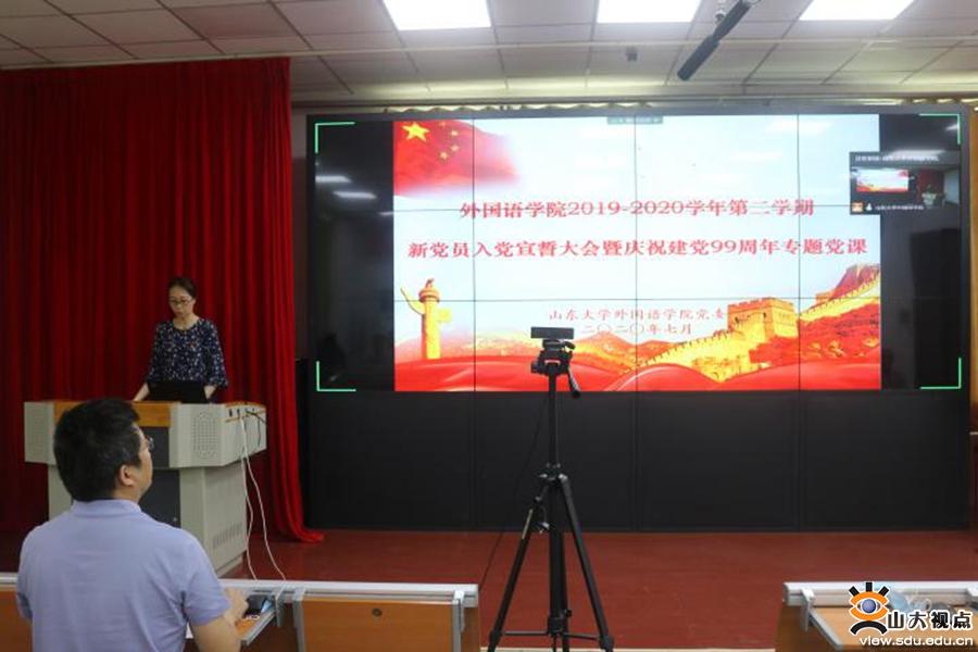 [本站讯]7月7日上午,外语学院党委组织召开2019-2020学年第二学期新党员入党宣誓大会暨庆祝建党99周年专题党课。此次大会采取了线上、线下相结合的形式。学院党委常务副书记薛佩军,院党委副书记王海华、魏鲁鸿,组织员周俊基出席会议。