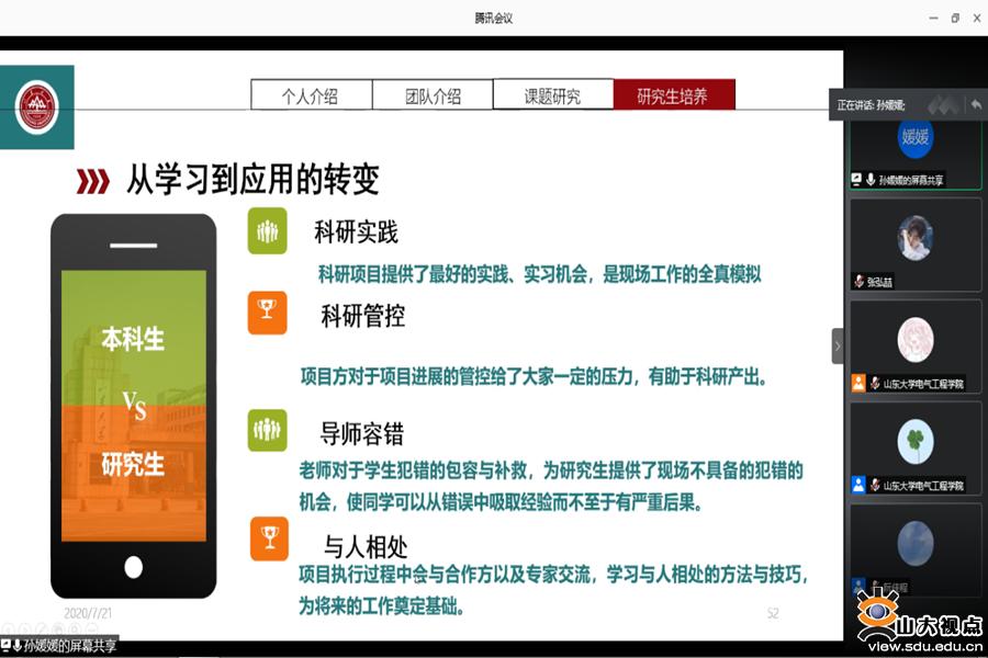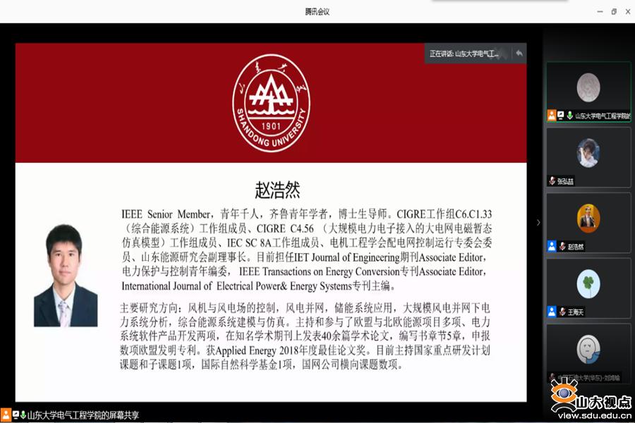 21日上午,电力电子与电力传动研究所孙媛媛老师介绍了科研团队的课题研究与研究生培养相关内容。山东省电科院刘洪正院长介绍了平价上网背景下的风电发展开发与展望。智能电网研究所郝全睿老师简要的介绍了MMC换流站的小信号建模和分析的基本原理。