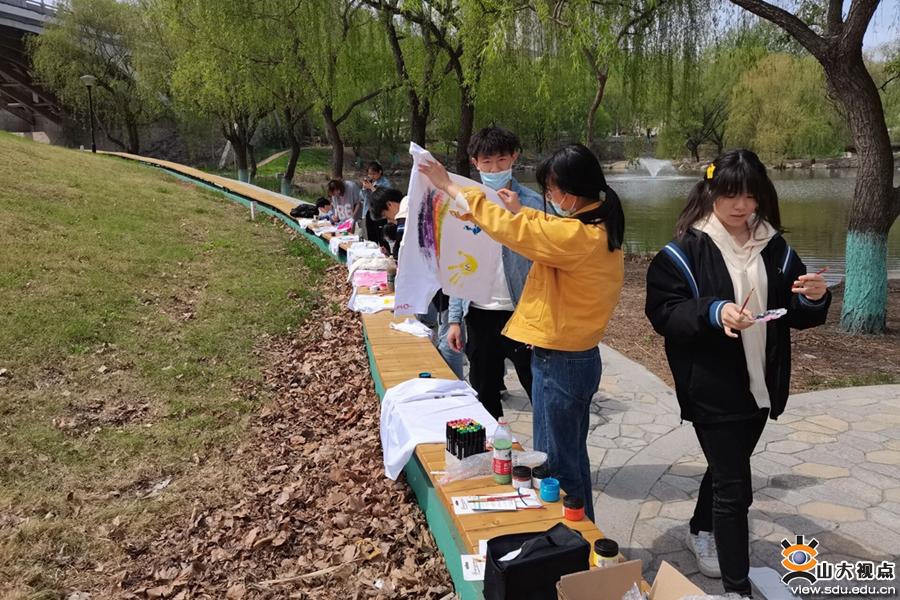 材料学院社团联合会和涂鸦部落社团共同策划本次活动,同学们通过丙烯颜料、马克笔、调色盘、白色画布、白色T恤、画笔等物资,描绘出对学校的祝福。一山一水一草一木等文字或图案,均表达了同学们对山大越来越好的美好愿景。