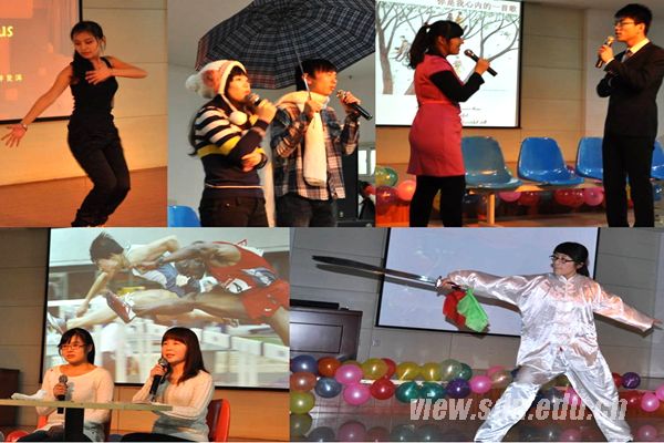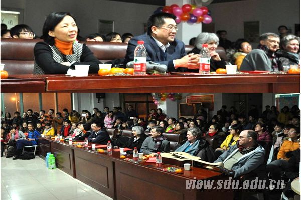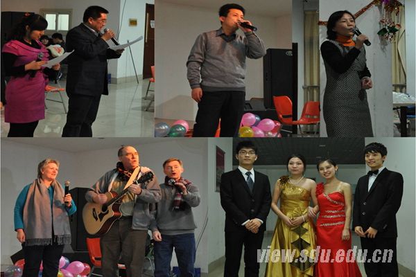 随后,一场劲爆的现代舞正式拉开了此场视听盛宴的序幕,现场气氛瞬间沸腾起来。深情婉转的情歌对唱《遇见》和《爱笑的眼睛》,热烈动感的励志歌曲《星星点灯》和《红日》接连上场。在老师风采环节,赵希波与朱强合唱的《好兄弟》和刘红带来的《那是你的眼神》将晚会推向高潮。外教Cox等人带来的吉他弹唱歌曲《lemon tree》节奏清新明朗、悠扬动听。在《猜歌词》和《谁是卧底》游戏互动环节,老师上台与大家一起参与到游戏中,欢声笑语响遍会场。小品《同福客栈》和《大话西游》中,幽默犀利的各地方言,滑稽搞笑的服饰化妆,夸张诙谐的肢体表演,博得在场观众掌声不断。精彩的团体武术表演《功夫》让大家一览中华武术的刚柔相合。在院研究生合唱团带来的歌曲《同一首歌》温馨而优美,晚会也逐渐接近尾声。院团委书记孙国翠及辅导员张洁、刘蓓蓓和朱强老师也参加了晚会,同时,学院Cox、Pamela Holt等五名外教老师也受邀来到晚会现场,和同学们共同度过了一个难忘的夜晚。