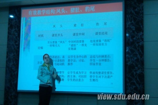胡岩谈到,近几年来土建学院引进了十数位年富力强的青年教师,学院对青年教师教学能力的提升非常重视,希望通过举办各种形式的教学活动,引进各种先进教学理念,提高教师队伍的建设。李赛强从高等学校改革教学的动力入手,围绕“国际视野下的本科教学质量提升之意义、认识我们的学生、了解我们自己、BOPPPS模式、微格教学、教学策略反思”,就教师如何改进教学方式和方法,如何让自己的课堂对学生更具有吸引力,如何正确处理与学生的关系等方面传授了自己的教学智慧和成果。土建学院教学咨询员刘广荣和徐帮树分别汇报了参加“山东大学高校教师骨干研修班”的收获和体会,介绍了BOPPPS教学和微格教学等先进教学模式,并精心组织了问卷调查,希望通过这些教学模式的开展提高青年教师的教学技巧。BOPPPS模块包含了成功课堂的六大要素,它给老师们提供了一个框架,这个框架涵盖了课堂教学的各个环节, 使课堂教学的安排更条理化、合理化。微格教学则是在每位教师讲完一个小型课后,组织小组教师对该教师的教学方法共同做出评价,不仅使讲课的教师更加清楚自己的优点和不足,同时也是大家共同受益、共同提高的重要过程。