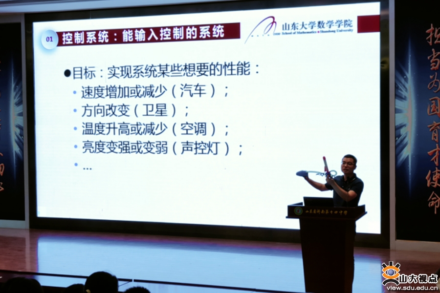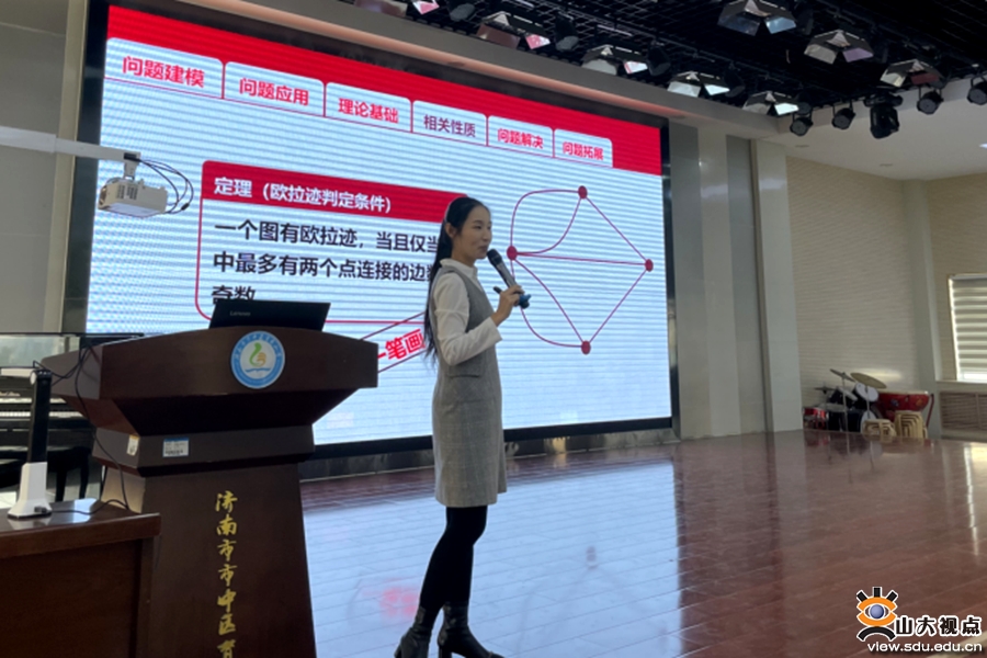 强基重在启智,科普点燃梦想。数学学院教工党支部积极响应党的二十大关于加强国家科普能力建设的新要求,从自己的专业领域出发,以风趣幽默的语言、生动形象的实例、独特直观的道具,讲授数学知识,弘扬数学家精神,普及前沿科技及研究成果。胡龙老师走进济南第十四中学、育文中学,向同学们介绍了控制论的发展历史及其在工程和科学领域的重要性;冯俊娥老师从生活中常见的事例入手,为山东大学附属中学的同学们带来了“控制无处不在”主题讲座;徐进老师在章丘双语学校作“生活中的博弈论”报告,引导同学们用博弈思想对问题进行分析;谭蕾老师针对学生认知水平,以“图形中的数学”为题,向市中区育秀小学的学生们介绍了与“一笔画”问题密切相关的图论知识。报告现场气氛热烈,学生们积极踊跃地提出自己的问题,老师们耐心细致地一一解答,用数学点亮梦想,发挥学科专家在推进科普事业发展和提升公民科学素质的示范引领作用。