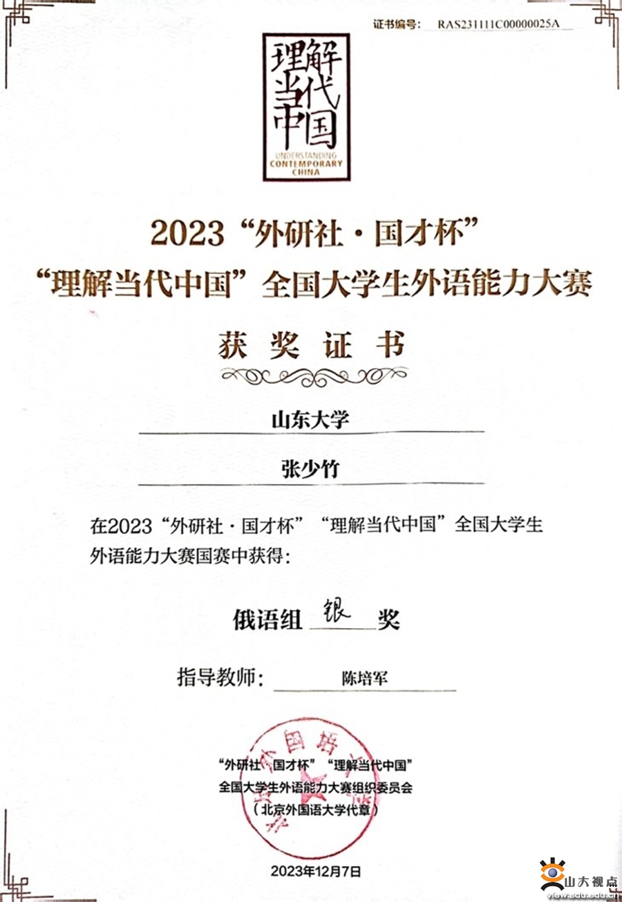 外国语学院两名学生凭借深刻的国情思政水平、过硬的俄语综合运用能力、灵活的思辨能力,在比赛过程中稳定发挥、灵活应变,展现了山大俄语系学子奋发向上的精神面貌。赛后,张少竹同学表示:“外研社‘理解当代中国’外语比赛从八月份就开始招募报名了,战线很长。九月份校赛,十月中旬省赛,从校赛到省赛再到两轮国赛,一直是边学习边惶恐。在陈培军老师的耐心指导下,第一次参加国家级重大赛事,就代表母校拿到了理想的成绩。此次比赛磨练了我的心志,增强了抗压能力,对于比赛过程中暴露出的不足之处,以后会努力改正,进一步提高自己!感谢陈培军老师和李学岩老师的关心与指导,感谢一直鼓励支持我的同学和朋友们。”李梦睿同学也感慨道:“非常感谢陈培军老师给了我这次机会参加此次大赛,在备赛的过程中也收获了来自学姐和老师的很多帮助和鼓励。通过此次比赛,我对传播中国声音有了更深层次的认识,在接下来的俄语学习道路上我也会更加努力,不断提高自身的能力。”