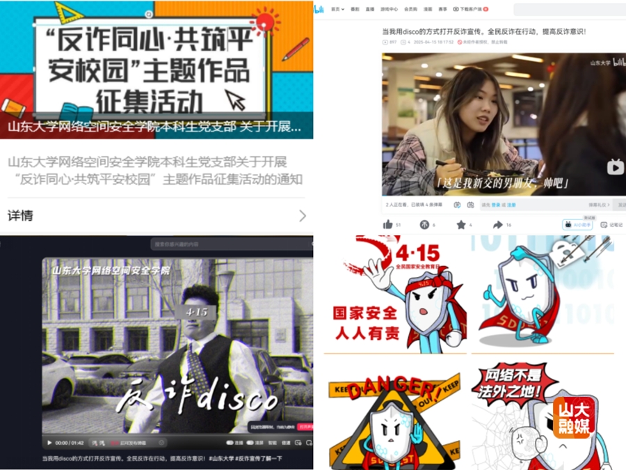 在活动中学。发起“反诈同心•共筑平安校园”主题活动,师生共同拍摄的《反诈disco》在山东大学官方抖音、B站账号播出,首日上线获赞超500人。组织“国家安全无小事,网络安全我先行”网安科普志愿服务活动,针对反诈、防骗、个人信息保护等热点问题进社区开展科普教育。设计制作“网小安”415国家安全主题表情包、动态海报,于4月15当天上线使用。