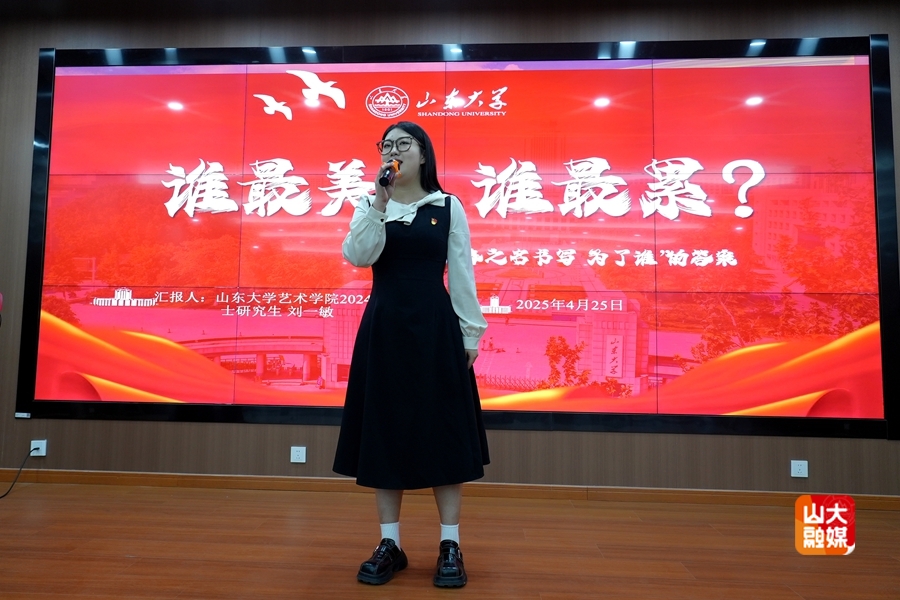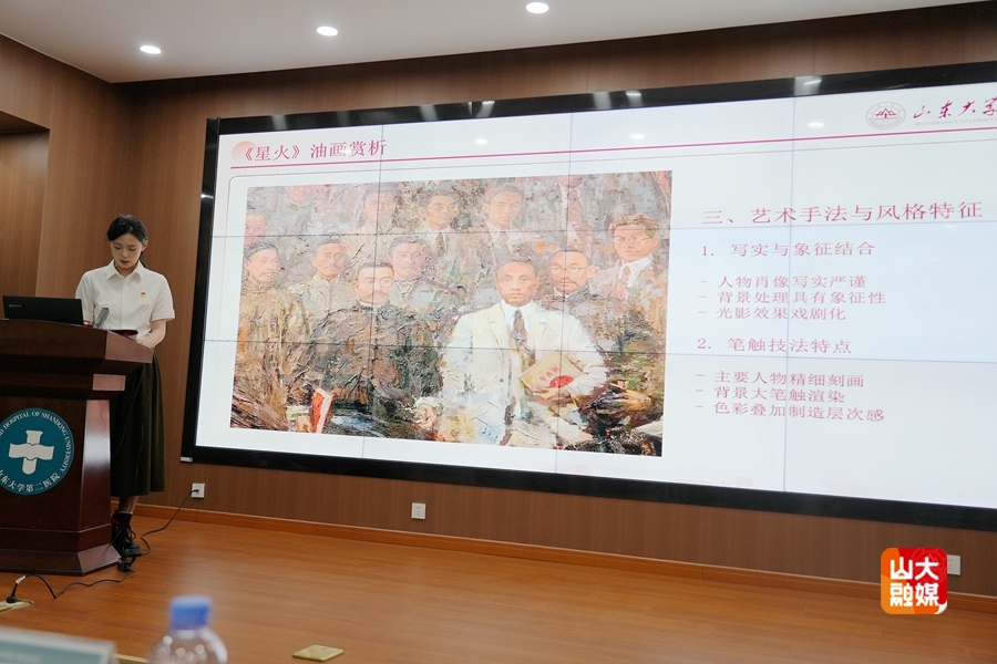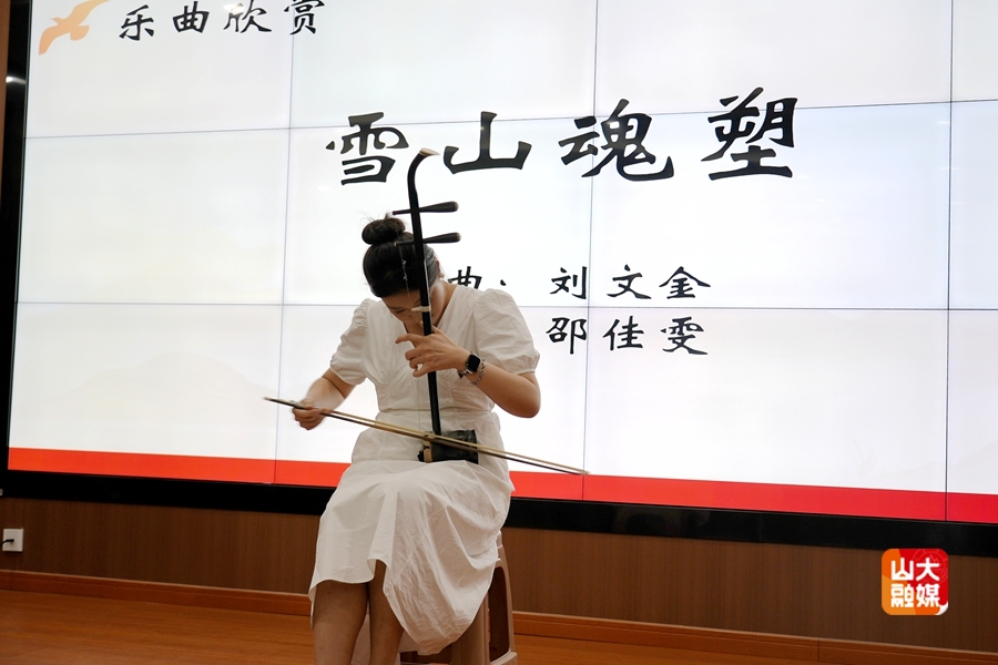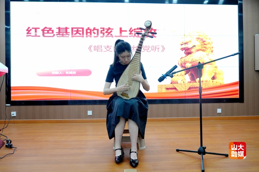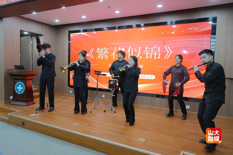 理论学习后,艺术学院音乐系学生党支部的学生党员和入党积极分子以精湛的技艺和饱满的热情,生动讲解并演绎了多个红色经典艺术作品。艺术学院学生的二胡作品《雪山魂塑》以磅礴的旋律描绘了红军长征途中翻越雪山的壮烈场景,展现了革命者不畏艰险的钢铁意志;声乐独唱《红梅赞》赞颂了江姐等革命先烈在敌人面前坚贞不屈、视死如归的高尚品格;歌曲《为了谁》,深情表达了对人民子弟兵的崇高敬意,唱出了军民鱼水情深的动人篇章;琵琶独奏《唱支山歌给党听》用灵动的音符诉说着对党的无限热爱与忠诚;声乐独唱《铁蹄下的歌女》,以悲怆的旋律控诉了旧社会的黑暗,呼唤民族觉醒;美术作品《五四运动》,通过生动的画面,再现了“五四运动”时期青年学生为国家命运奔走呼号、奋起抗争的壮丽场景。山东大学吹打乐团的同学们表演的《繁花似锦》,以欢快的节奏和热烈的氛围,展现了新时代祖国的繁荣昌盛和人民的幸福生活。