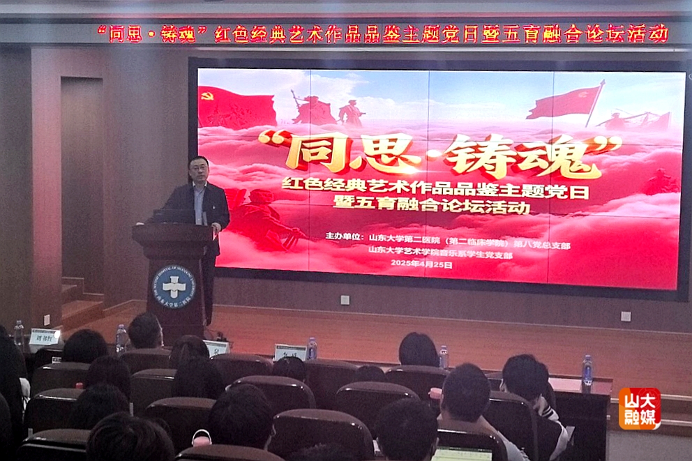 [本站讯]4月25日,由艺术学院音乐系学生党支部与第二医院(第二临床学院)第八党总支联合主办的“同思·铸魂”红色经典艺术作品学习与品鉴特色主题党日暨五育融合论坛活动在第二医院文会学堂举行。艺术学院党委副书记李勇,第二医院(第二临床学院)党委副书记、副院长李泉,副处级组织员孔令华出席活动。