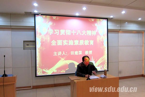 [本站讯]12月29日,口腔医学院在多功能报告厅举行“学习贯彻十八大精神,全面实施素质教育”专题讲座。讲座邀请山东省政府参事田建国教授为医院全体党员作报告,口腔医院党委书记赵华强等部分医院领导及中层干部,全体教职工与学生党员参加了讲座。讲座由赵华强主持。