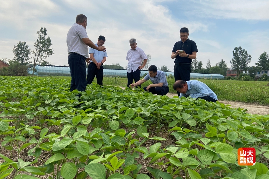 扛牢主体责任,守护粮食安全。调研团一行前往确山县留庄镇实地调研学院向凤宁教授团队研发大豆品系“山大5号”推广种植情况,目前大豆生长正值苗期,“山大5号”较同期大豆品种,植株粗壮、长势优良,受到当地农户欢迎。