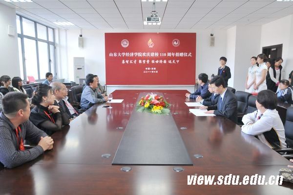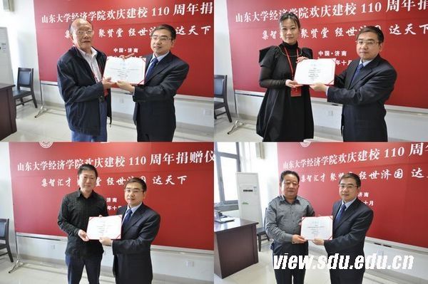 10月15日,经济学院在会议室举行欢庆建校110周年捐赠仪式。经济学院常务副院长胡金焱、党委书记陈宏伟,党委副书记李维林、齐山华,老前辈代表、师生代表参加了捐赠仪式,仪式由陈宏伟主持。胡金焱代表学院接受捐赠并为每位捐赠者颁发了捐赠证书。在捐赠仪式上,山东大学经济学院原副院长、山东瑞川硅业有限公司董事鲍士龙捐赠100万元、山东格力电子科技有限公司捐赠50万元、山东大学经济系77级校友姜东溟捐赠20万元、山东聊建金柱建设集团有限公司董事长兹留柱捐赠30万元。胡金焱在讲话中谈到,此次捐赠仪式见证了各位校友和嘉宾对经济学院的关心和热爱,他代表学院对各位的捐赠义举表示感谢。同时,他还详细介绍了学院的聚贤教育基金:“聚”是汇聚教育资源,积少成多,为将来人才培养和学科建设提供物质基础;“贤”是贤人,即优秀的师资和学生,也是关心学院发展的优秀校友和各位嘉宾;聚贤教育基金用来支持和推动山东大学经济学院人才队伍建设,吸引海外优秀人才。