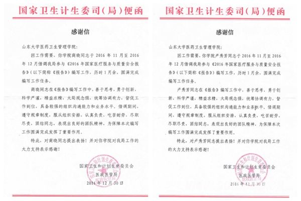 2016年11月至2016年12月,因工作需要,医管学院商晓、卢秀芳同学借调国家卫生和计划生育委员会医政医管局参与《2016国家医疗服务与质量安全报告》编写工作,历时一月余,完成编写工作任务,受到国家卫计委医政医管局的专函表扬。