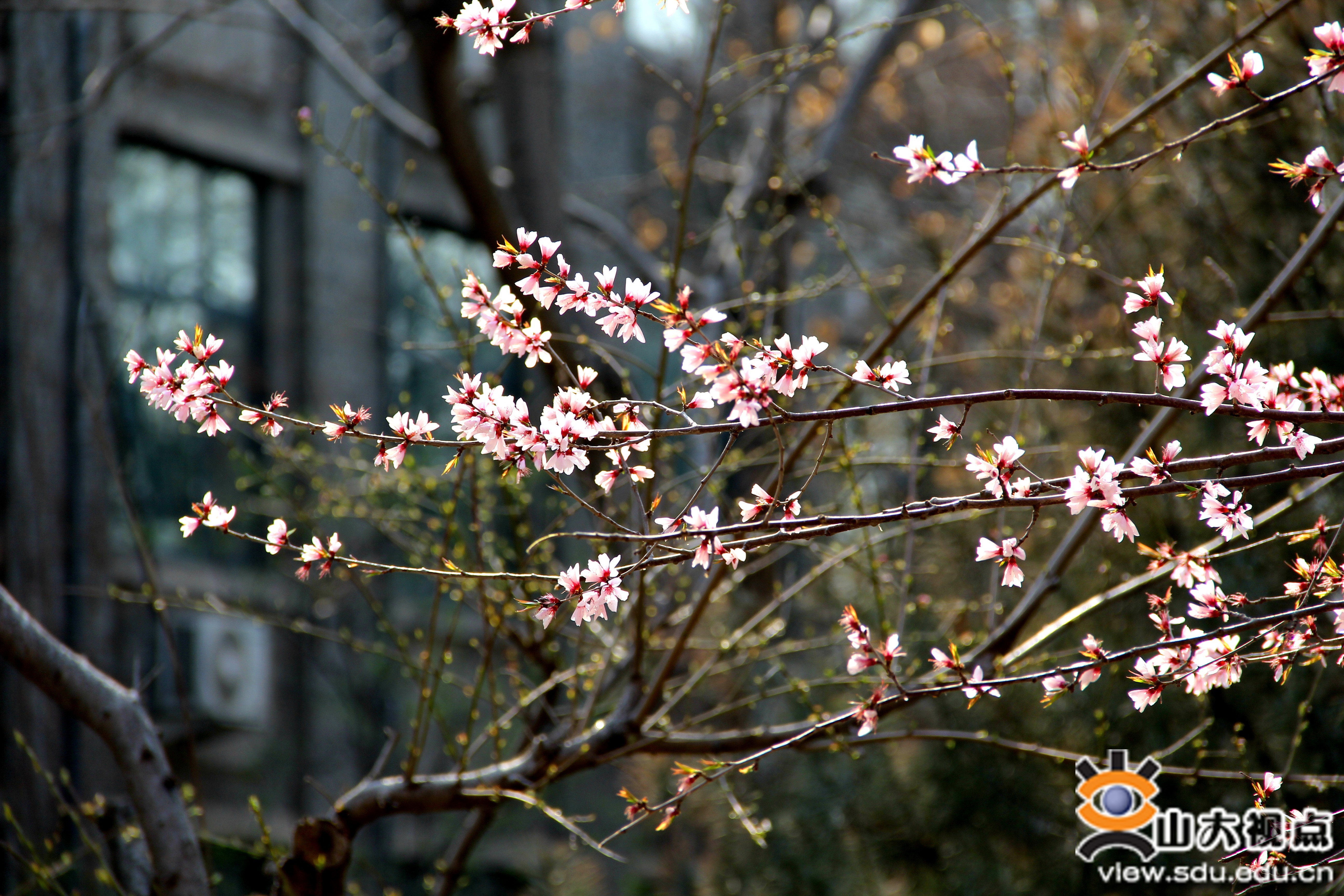 水红色的几瓣小花,偶然间映入眼帘,惹人怜惜。在规整的教学楼间偷偷潜入学子的视线,为天气回暖的校园再添一抹春意。