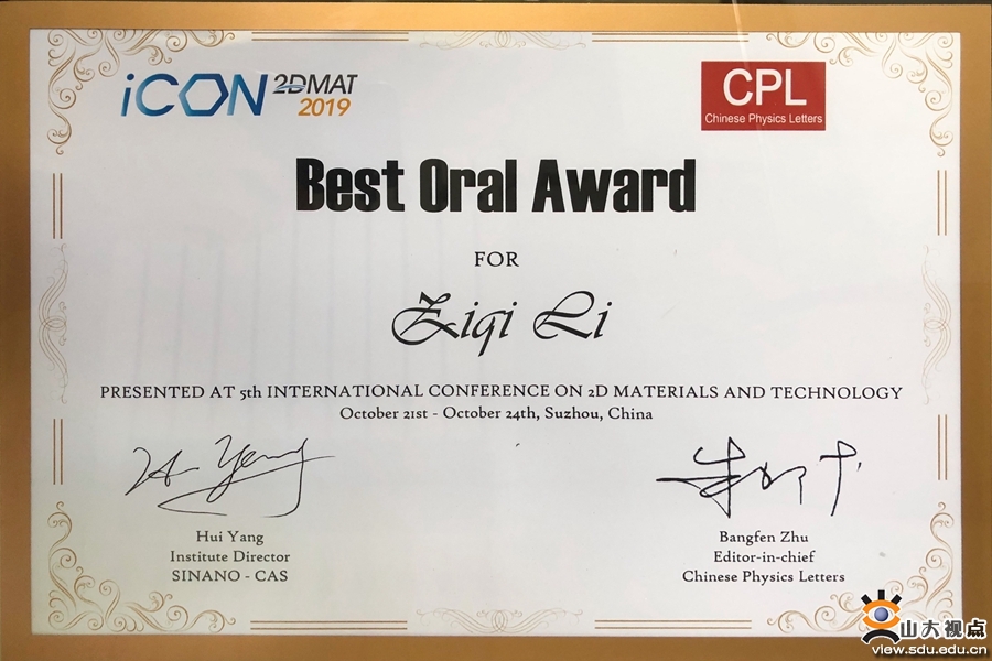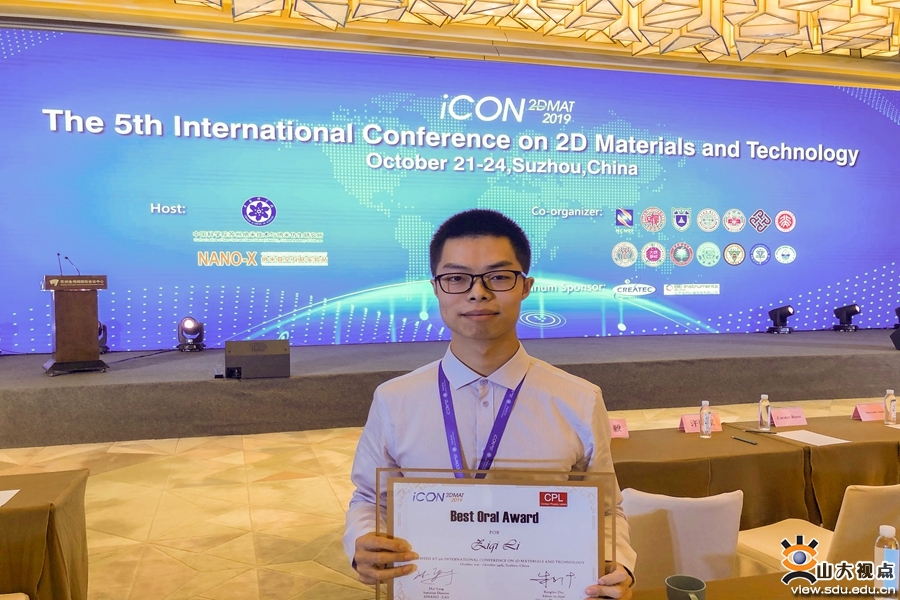 [本站讯]10月21-24日,第五届二维材料国际会议(International Conference on 2D Materials and Technology, ICON-2DMAT 2019)在苏州国际博览中心举办。本次会议共有118场特邀报告、85场口头报告和123份墙报展示。山东大学物理学院陈峰教授课题组博士生李子琦作了全英文口头报告,介绍了二维过渡金属硫属化物的非线性光学性质及其在波导激光中的应用,并荣获了本届会议“最佳口头报告奖”。