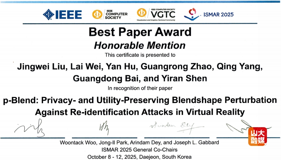[本站讯]近日,IEEE International Symposium on Mixed and Augmented Reality(ISMAR)在韩国大田广域市召开,软件学院智能图形图像处理实验室(IGIP)教授沈益冉,研究生刘敬炜、张晨龙,山东大学-南洋理工大学人工智能国际联合研究院(C-FAIR)卜令国教授团队研究生赵阳参加会议,并汇报展示论文成果。其中,论文“p-Blend: Privacy- and Utility-Preserving Blendshape Perturbation Against Re-identification Attacks in Virtual Reality”获2025 ISMAR Best Paper Award Honorable Mention(最佳论文提名)。