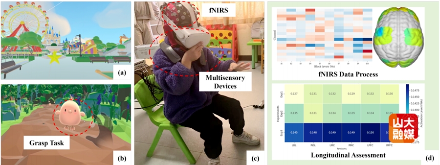 研究团队针对自闭症儿童传统作业治疗中存在的参与度低、个体差异大及评估主观性强等问题,提出并开发了一个基于虚拟现实的个性化多感官作业治疗系统——P-MARS。该系统结合视觉、听觉与嗅觉刺激,通过ChatGPT分析儿童感官偏好并生成个性化虚拟场景(如森林、游乐园等),利用Suno AI生成匹配的音乐,并通过嗅觉设备实现多感官协同训练。同时引入功能性近红外光谱(fNIRS)技术,通过纵向追踪实验采集受试儿童的不同阶段的脑数据,实现对脑活动的客观监测,并基于wavelet amplitude (WA) 对监测结果进行分析。实验结果表明,P-MARS能够显著提升儿童的注意力与认知效率,促进神经适应性发展,为自闭症康复提供了一种智能化、数据驱动的创新路径。软件学院研究生赵阳为该篇文章的第一作者,卜令国教授为通讯作者。