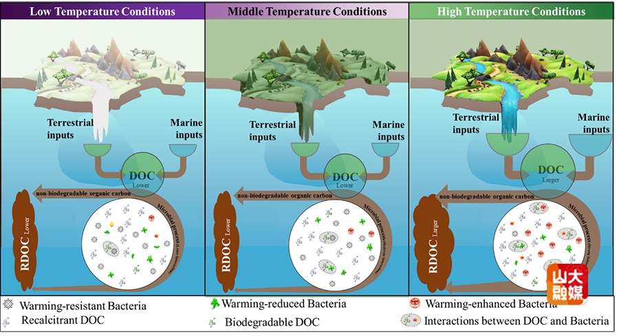 近海生态系统是连接陆地和海洋的过渡区域,以全球约7%的海洋面积贡献25%的海洋初级生产力。在全球变暖背景下,理解温度变化对近海微生物转化溶解有机碳的动态规律,对于预测未来碳源汇格局至关重要。