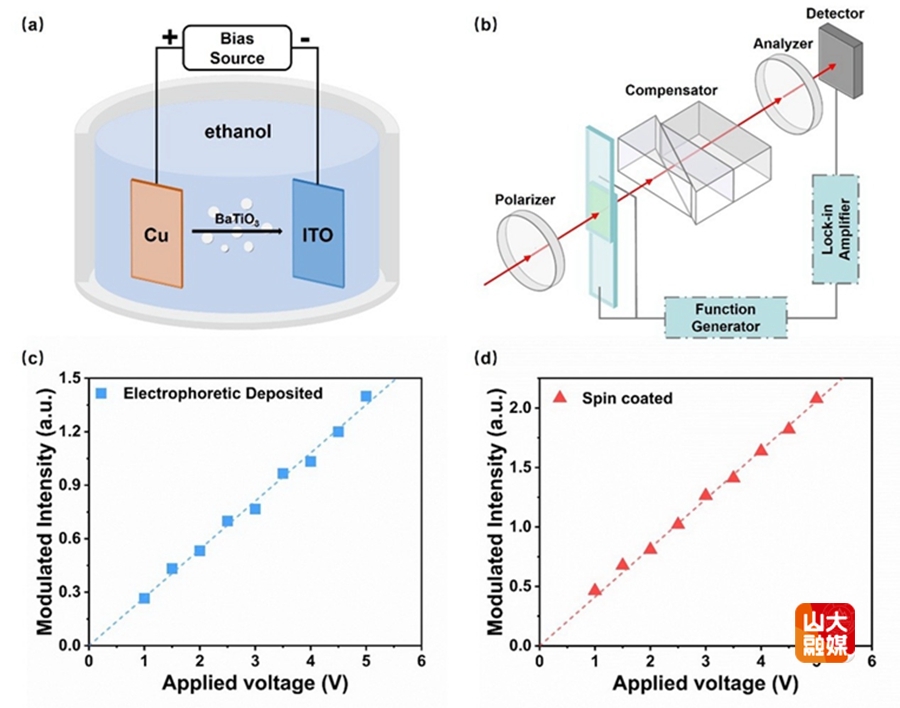 该研究创新性提出了一种电泳沉积(EPD)制备策略,通过外加电场驱动带电BTO纳米晶体在基底上有序沉积,促进晶体取向与极化方向的部分一致性,从而显著提升薄膜的电光响应。实验结果显示,EPD法制备的BTO纳米晶薄膜具有良好择优取向,其电光系数较传统旋涂法薄膜提升约360倍,甚至超过商用LiNbO3单晶。这一结果为低成本、高效率电光调制材料的开发提供了新思路。