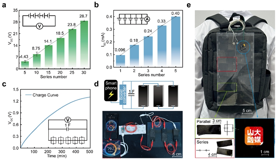 研究团队成功构建了一个由100个GEMEG单元组成的紧凑型户外电源模块(体积24 cm3),可直接驱动户外LED照明系统,并通过超级电容器为手机充电,展现出在野外、应急供电等场景下的应用潜力。