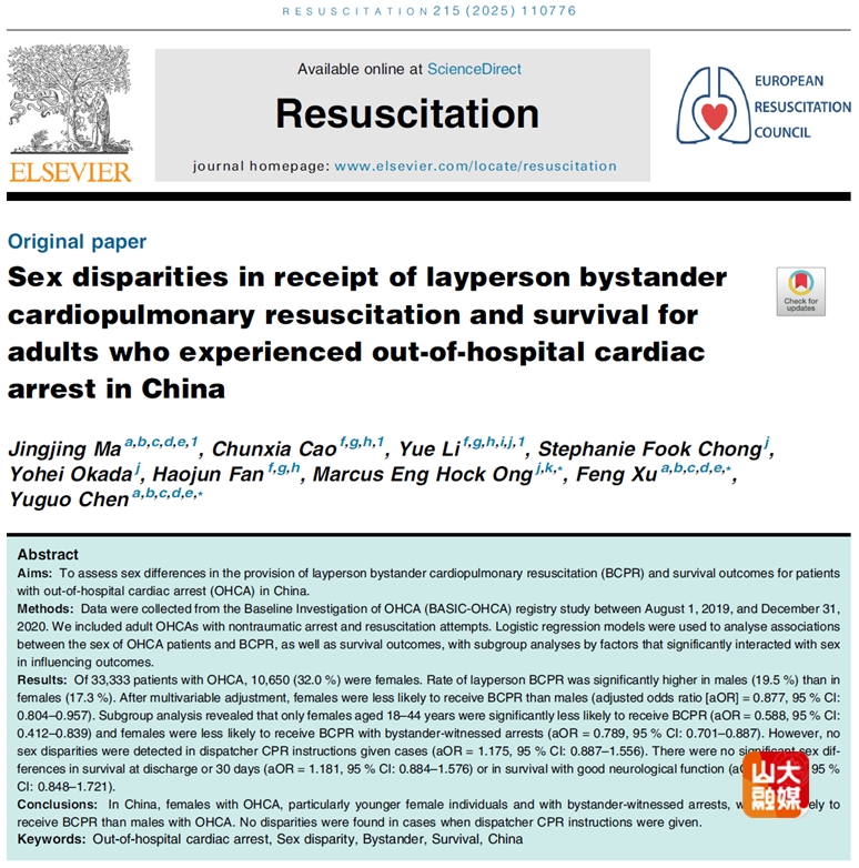 [本站讯]近日,山东大学齐鲁医院急诊科、教育部急危重症医药基础研究创新中心、山东省急危重症临床医学研究中心陈玉国/徐峰团队在国际急诊医学领域权威期刊Resuscitation(中科院1区)在线发表了题为“Sex disparities in receipt of layperson bystander cardiopulmonary resuscitation and survival for adults who experienced out-of-hospital cardiac arrest in China”的研究论文。该研究基于齐鲁医院急诊团队牵头开展的我国首个全国性、前瞻性的心脏骤停队列(The BASeline Investigation of Cardiac Arrest,BASIC),评估了中国院外心脏骤停(OHCA)患者中旁观者心肺复苏(BCPR)及生存结局的性别差异,对于提高旁观者心肺复苏术实施率、进一步改善心脏骤停患者生存率具有重要意义。山东大学齐鲁医院副主任医师马静静为论文第一作者,陈玉国教授、徐峰教授为共同通讯作者。山东大学齐鲁医院为第一和通讯作者单位。