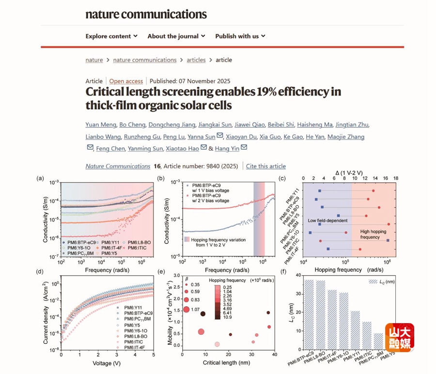 进展一:有机太阳能电池的商业化需要开发厚膜活性层,但目前基于零场迁移率的厚膜兼容受体选择是不可靠的。研究团队建立了一种新方法,揭示临界长度是决定厚膜有机光伏器件性能的关键因素,为厚膜兼容型有机半导体材料的筛选提供了重要依据。相关研究成果以“Critical length screening enables 19% efficiency in thick-film organic solar cells”为题发表于Nature Communications,山东大学硕士研究生孟媛为论文第一作者,通讯作者为山东大学教授殷航、郝晓涛、张茂杰、孙延娜,山东大学为第一作者单位和通讯作者单位。