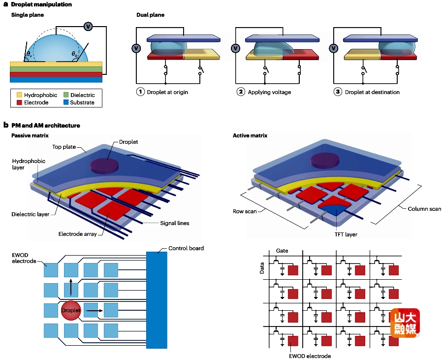 [本站讯]近日,信息科学与工程学院Arokia Nathan院士、于俊教授团队在国际顶级综述期刊Nature Reviews Electrical Engineering发表题为“Active-matrix digital microfluidics for high-throughput, precise droplet handling”的综述文章,首次系统阐明有源矩阵数字微流控的基本原理及技术路线,并前瞻其在精准医疗等前沿领域的应用前景。山东大学信息科学与工程学院助理研究员王东平、博士研究生姜圣哲为该文章共同第一作者。中国科学院苏州医工所、电子科技大学教授马汉彬,于俊教授、Arokia Nathan院士担任共同通讯作者。山东大学为第一通讯单位。这是山东大学首次在该期刊上发文。