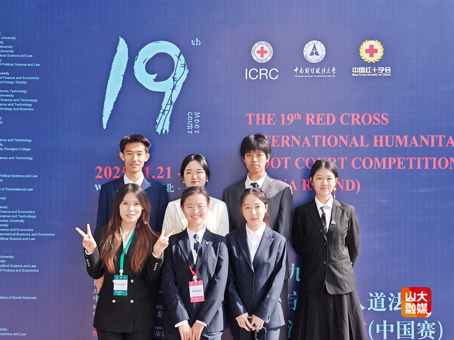由纪检监察学院学生组成的山东大学(威海)代表队(指导教师:方芳)由2022级本科生朱芮娴担任学生教练,2023级本科生周怡然与2024级研究生彭劲超担任庭辩员,2023级本科生廉大任、于晓宇以及2024级本科生郭亚飞、孙嘉澧担任研究员。备赛期间,队员们深入研读了大量法律条文,系统梳理了相关案例,开展了多轮模拟辩论演练。在庭辩轮的比赛中,参赛队员围绕国际刑法中的是否存在武装冲突及武装冲突的性质、《罗马规约》战争罪下的谋杀和酷刑、文职上级责任和个人刑责等议题展开激烈辩论和对抗。队员们凭借扎实的法学功底、沉稳的庭辩风范与得体的法庭礼仪,赢得法官们的一致认可,夺得第十九届红十字国际人道法模拟法庭竞赛(中国赛)冠军。