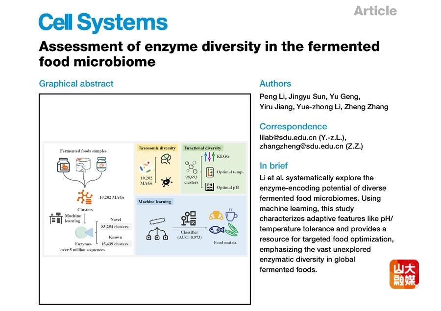 [本站讯]近日,微生物改造技术全国重点实验室(研究院)张正/李越中教授团队在中科院1区Top期刊Cell Systems发表了题为“Assessment of enzyme diversity in the fermented food microbiome”的研究论文。实验室博士研究生李鹏、硕士研究生孙婧钰为共同第一作者,张正研究员、李越中教授为共同通讯作者,山东大学微生物改造技术全国重点实验室为唯一作者单位。Cell Systems期刊将该论文选为当期封面论文,并配发了专题评论推荐(Preview)。