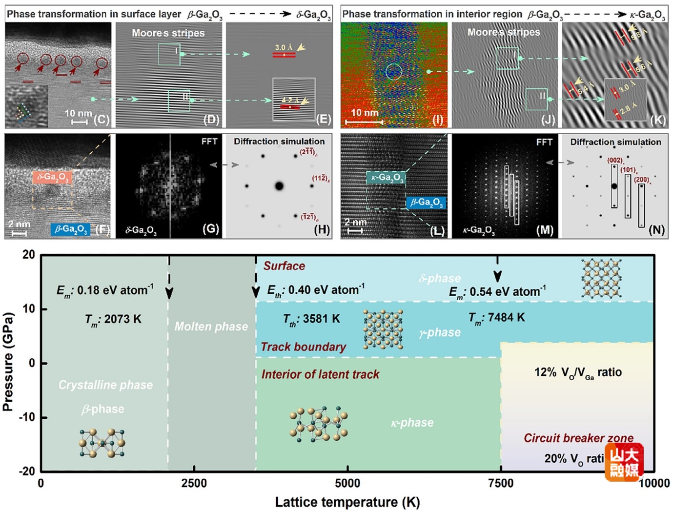 Ga₂O₃作为超宽禁带半导体材料的典型代表,在辐射探测、功率器件、紫外光电、气体传感等多学科前沿领域展现出应用潜力,其核心物性与器件性能依赖于Ga₂O₃的α、β、γ、δ、κ等多种晶相结构;系统揭示不同晶相的形成并使其过程可控,成为Ga₂O₃研究与应用的基础。本工作基于国家重大科技基础设施—兰州重离子加速器(HIRFL),通过高能重离子辐照在b-Ga2O3晶格系统内产生局域的高密度能量沉积,该瞬态过程诱导b-Ga2O3产生熔融态与径迹区,在随后能量耗散过程中呈现出多级相变特征:径迹区内将形成与富集以氧空位为主的空位型缺陷,其诱导产生的局域负压驱动了b®k相变;镓原子沿径迹方向被输运至表面微区,形成与富集以镓原子为主的填隙缺陷,其诱导产生的局域正压进一步驱动了k®d相变;相稳定性满足d<k<b。该工作探索了能量沉积密度、辐照缺陷类型、局域应变应力场与不同亚稳态相变路径之间的内在关联,明确了中间相在相变路径调控中起到的关键介导作用,并构建了基于辐照缺陷驱动的β→κ/γ/δ相变路径判据。