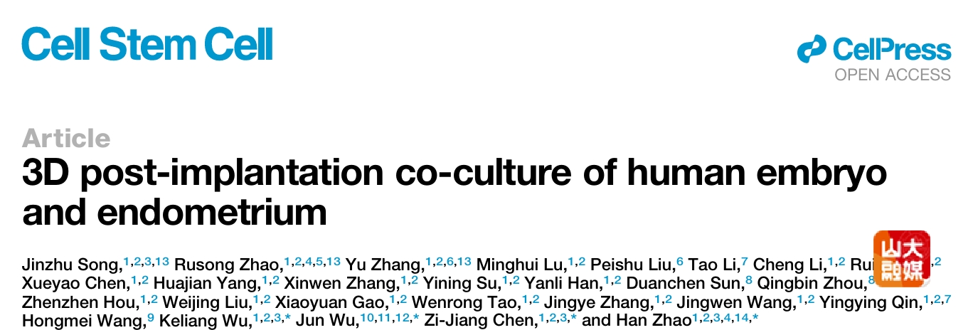 [本站讯]近日,山东大学妇儿与生殖健康研究院陈子江院士、赵涵教授、吴克良教授团队联合美国西南医学中心吴军教授团队在《细胞-干细胞》(Cell Stem Cell)期刊在线报道了题为“3D Post-Implantation Co-Culture of Human Embryo and Endometrium”的长篇研究论文。赵涵教授、陈子江院士、吴克良教授、吴军教授为本文共同通讯作者。山东大学妇儿与生殖健康研究院宋劲竹、南京医科大学副教授赵如凇、山东大学齐鲁医院博士后张玉为本文共同第一作者。山东大学为第一作者单位和通讯作者单位。