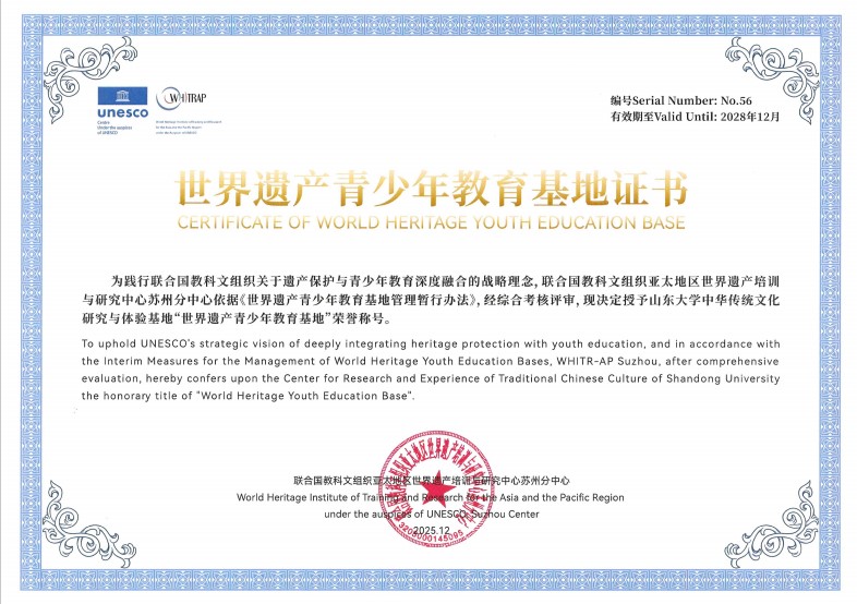 [本站讯]近日,由联合国教科文组织东亚地区办事处、联合国教科文组织亚太地区世界遗产培训与研究中心(WHITRAP)组成的专家组对山东大学进行现场评审。经评估,山东大学中华传统文化研究与体验基地获评“世界遗产青少年教育基地”称号。