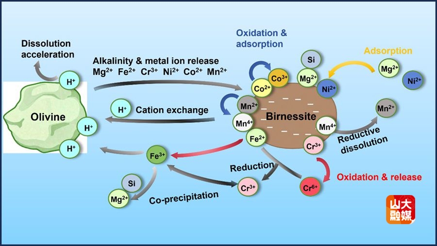 图1 锰氧化物介导的橄榄石溶解与痕量金属归趋机制示意图