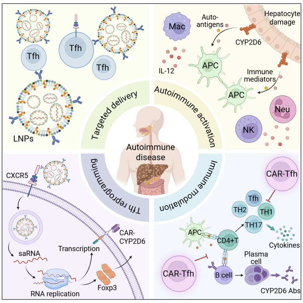 该研究建立了一种体内原位滤泡辅助T(Tfh)细胞重编程策略,可在体内原位生成兼具抗原识别与免疫调节功能的嵌合抗原受体Tfh(CAR-Tfh)细胞,并在自身免疫性肝炎模型中实现对异常免疫攻击与肝脏炎症的协同抑制。研究开发了基于色氨酸来源脂质纳米颗粒的体内递送体系,并整合自扩增RNA(saRNA)策略,提升了核酸分子体内递送效率并延长其表达持续时间。在此基础上,研究以AIH-II为疾病模型,围绕关键自身抗原CYP2D6构建抗原特异性CAR识别模块,并结合Foxp3介导的调节性程序重塑,实现了Tfh细胞向CAR-Tfh细胞的体内重编程。在AIH-II小鼠模型中,原位生成的CAR-Tfh细胞表现出抗原特异性识别能力,并对肝脏免疫微环境产生整体调控效应。研究显示,CAR-Tfh通过抑制异常活化的致病性T细胞反应,削弱B细胞活化及自身抗体相关通路,促进肝脏免疫环境向耐受状态恢复,并同步改善多项自身免疫性肝损伤指标。