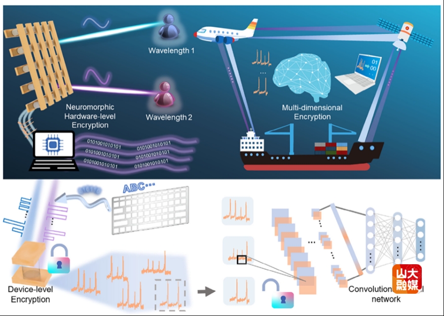 [本站讯]近日,山东大学集成电路学院王天宇、孟佳琳团队在新型低功耗光电神经形态硬件与AI加密系统方向取得重要进展,实现海上加密通讯的“敌我识别”。相关成果以“Low Power Optoelectronic Neuromorphic Memristor for In‐Sensor Computing and Multilevel Hardware Encryption”为题发表在国际著名期刊Advanced Science(中科院一区,影响因子:14.3)。集成电路学院研究生孙渤为论文第一作者,山东大学集成电路学院研究员王天宇、教授孟佳琳为论文共同通讯作者,集成电路学院为论文第一完成单位。