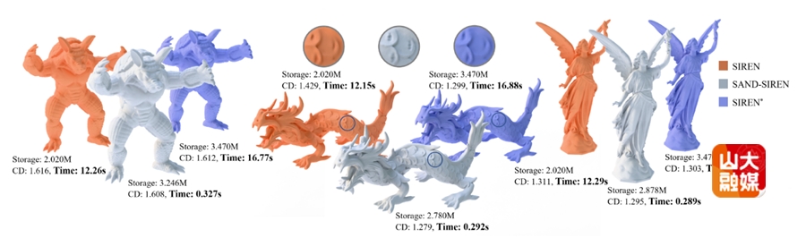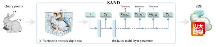 该研究聚焦神经隐式表示在几何建模中的高效计算问题,隐式神经表示在实际应用中往往需要对每个查询点执行完整网络推理,计算开销高,成为制约其应用的重要瓶颈。针对这一问题,论文提出了一种空间自适应网络深度的高效建模框架 SAND,通过引入体素化网络深度映射与带分支的多层感知机,实现了根据空间区域的几何复杂度动态调整网络计算深度,突破了传统隐式表示统一计算深度的限制,实现了计算资源在空间上的自适应分配,为高效三维重建、神经渲染以及相关应用提供了新的解决思路。山东大学为论文第一完成单位,软件学院硕士研究生杨传祥为该篇文章的第一作者,软件学院教授周元峰、德州农工大学教授王文平为通讯作者。合作作者包含软件学院副研究员魏广顺,香港城市大学副教授侯军辉,香港城市大学任思宇,香港科技大学助理教授刘缘,香港大学教授Taku Komura。