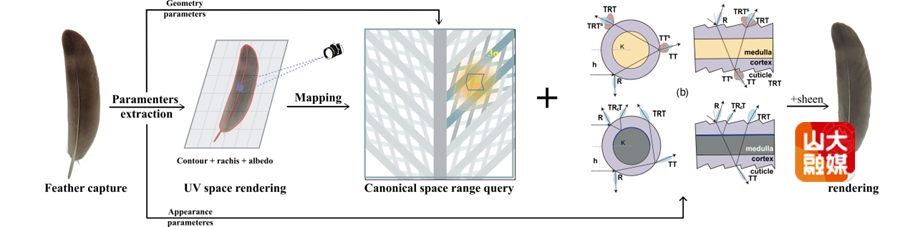 该研究聚焦鸟类羽毛实时渲染的效率与真实感平衡难题,传统羽毛渲染方法存在内存开销大、渲染速度慢、难以还原真实羽毛光学特征等问题。针对这一瓶颈,论文提出程序化多尺度实时羽毛外观建模框架,仅需单张羽毛照片即可完成建模,构建紧凑层级化表示并设计专用散射模型与光泽效果;通过自适应多尺度查询与遮蔽处理,实现高保真、抗锯齿的实时渲染。该方法内存占用仅为传统显式几何模型的0.02%,可高效还原羽毛蓬松质感与结构色,为游戏、虚拟现实、影视特效等领域的数字鸟类渲染提供了全新高效解决方案。山东大学为论文第一完成单位,软件学院硕士研究生陈翔为该篇文章的第一作者,软件学院研究员朱君秋为通讯作者。合作作者包含山东大学软件学院博士研究生王寿义、教授王璐,墨尔本大学助理教授陈滨,曼彻斯特大学助理教授Zahra Montazeri,穆罕默德·本·扎耶德人工智能大学教授闫令琪。