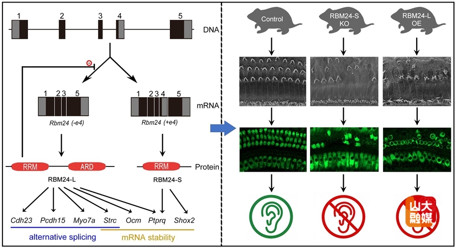 本研究利用两个小鼠模型对Rbm24基因可变剪接在听觉转导中的生理意义及调控机制进行了深入探讨。研究发现Rbm24基因4号外显子敲除(KO)小鼠和RBM24长亚型蛋白过表达(OE)小鼠都表现出严重的先天性耳聋,扫描电子显微镜结果显示小鼠静纤毛形态异常,最终导致静纤毛的整体丢失及毛细胞的大量死亡。研究进一步对敲除小鼠和过表达小鼠的耳蜗组织进行了转录组测序,鉴定出多个重要的RBM24下游靶RNA。值得注意的是,RBM24长亚型和短亚型蛋白共享相同的RNA结合结构域,二者却能结合不同的靶RNA并调控其可变剪接或稳定性。综上,本研究表明Rbm24基因可变剪接调控静纤毛发育及听觉转导,并揭示了其背后的调控机制。