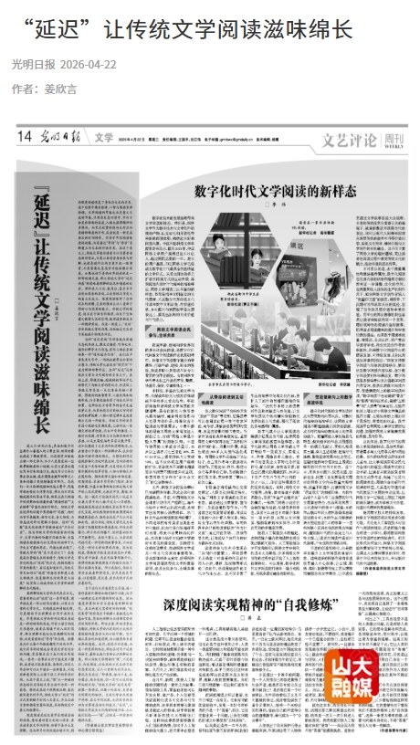 [本站讯]4月22日,文学院博士研究生姜欣言在《光明日报》发表题为《“延迟”让传统文学阅读滋味绵长》的文章。