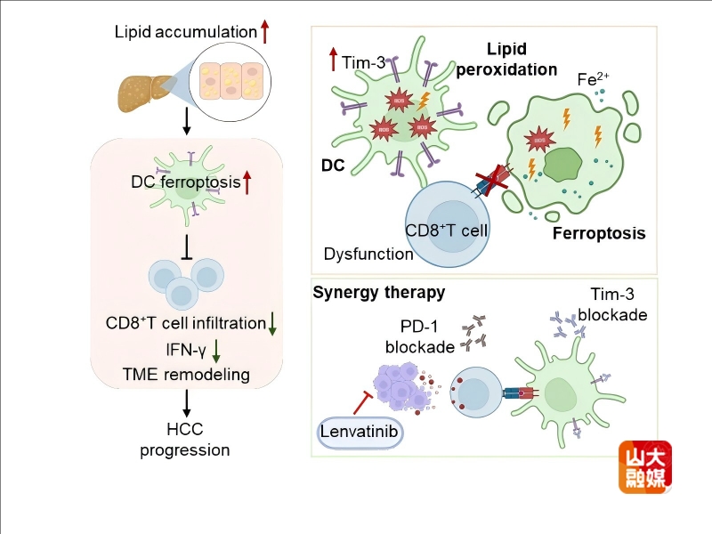 本研究结合单细胞测序、多种MASLD-HCC动物模型及临床样本,系统解析了高脂微环境中树突状细胞(DC)的功能异常及其调控机制。研究发现,MASLD-HCC患者肿瘤组织中DC浸润显著减少,DC与CD8⁺ T细胞之间的互作严重受损,且DC数量的减少与患者不良预后密切相关。机制研究表明,高脂微环境可上调DC表面Tim-3的表达,增强其对游离脂肪酸的摄取,引发脂质积累及过氧化,从而诱导DC发生铁死亡,导致DC耗竭及其抗原提呈功能障碍,最终抑制CD8⁺ T细胞介导的抗肿瘤免疫应答。尤为值得关注的是,Tim-3基因敲除或抗体阻断可有效保护DC免于铁死亡,恢复其免疫激活功能,并与抗PD-1抗体或一线靶向药物仑伐替尼产生协同作用,显著抑制MASLD-HCC进展。该研究不仅阐明了Tim-3在MASLD-HCC免疫逃逸中的关键作用,也为开发靶向Tim-3/铁死亡通路的新型联合治疗策略提供了重要的理论依据和潜在干预靶点。