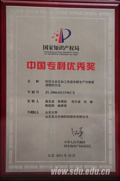 曲音波教授主持完成的国家发明专利“利用玉米芯加工残渣发酵生产纤维素酒精的方法(ZL200610131965.X)”,率先在山东龙力生物科技股份有限公司投入了实际应用,在国际上首次建成了用玉米芯木糖残渣年产3000吨纤维素乙醇的中试生产装置和万吨级的生产示范装置,使纤维素乙醇生产成本接近了粮食乙醇生产水平。2012年5月,国家发改委正式批准山东龙力公司5万吨纤维素乙醇项目,使其成为国内首家纤维素乙醇定点生产厂,也成为世界上最早实现纤维素资源生物炼制产业化的企业,其产品已经进入汽油销售市场。该成果先后获得了山东省技术发明一等奖和国家技术发明二等奖。最近,又成功获得国家知识产权局颁发的2013年中国专利优秀奖。